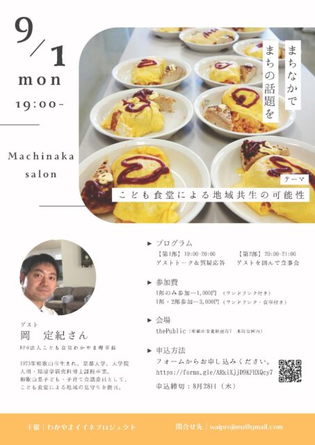 9月1日(月)、本町公園(和歌山市北桶屋町)内のthePublicで「まちなかサロン|こども食堂による地域共生の可能性」が開催されます。