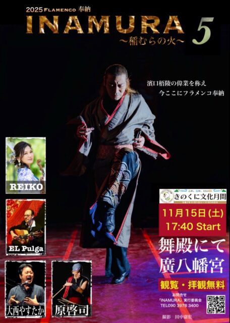 11月15日(土)、広川町の廣八幡宮で「2025FLAMENCO奉納 INAMURA5 ~稲むらの火~」が開催されます。