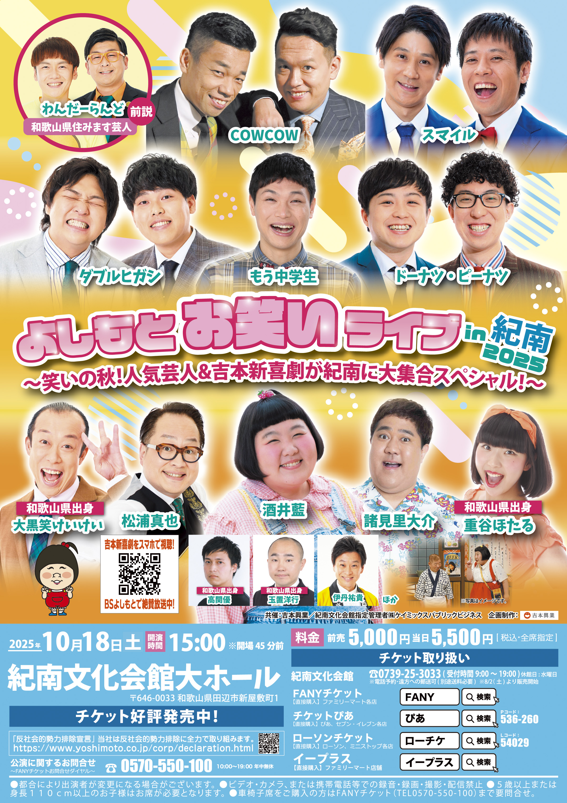 10月18日(土)、田辺市の紀南文化会館で「よしもとお笑いライブin紀南2025~笑いの秋!人気芸人&吉本新喜劇が紀南に大集合スペシャル!~」が開催されます。