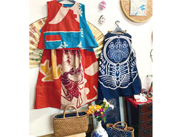 大島や絣(かすり)、のぼり旗のチュニックワンピース、バッグ、山葡萄(ぶどう)のカゴバッグなどが展示されます。古布を利用したデザインの魅力に触れてみてください。