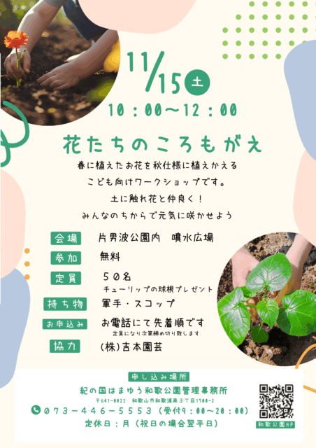 11月15日(水)、和歌山市の片男波公園で「花たちのころもがえ」が開催されます。春に植えた花を秋仕様に植え替える、子ども向けのワークショップです。