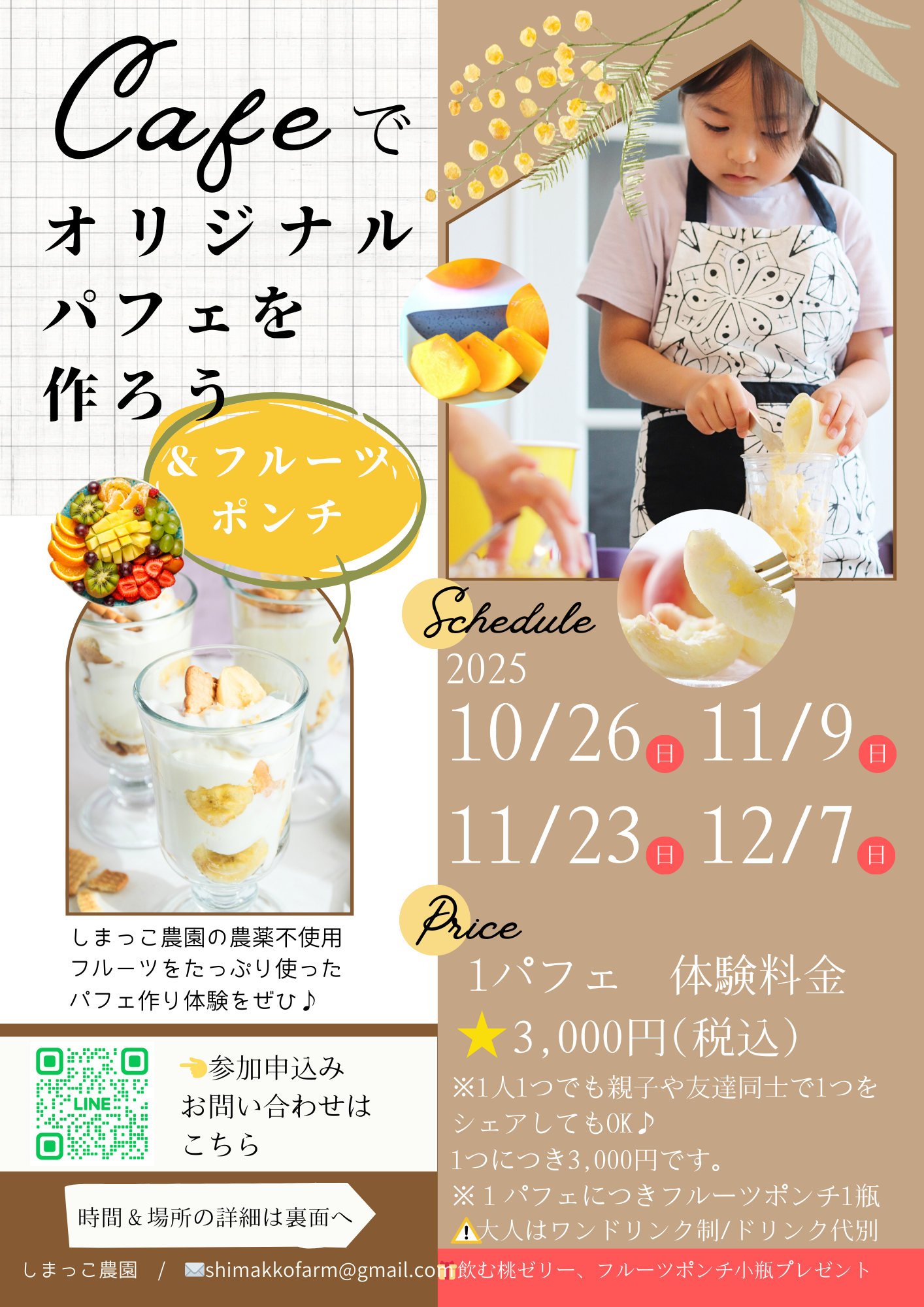 和歌山県紀の川市のオーガニック果物農家、しまっこ農園のフルーツをつかったパフェ作り体験。五感を使って楽しめるので小さなお子様にもおすすめです。飲む桃ゼリーなどのプレゼントもあり。