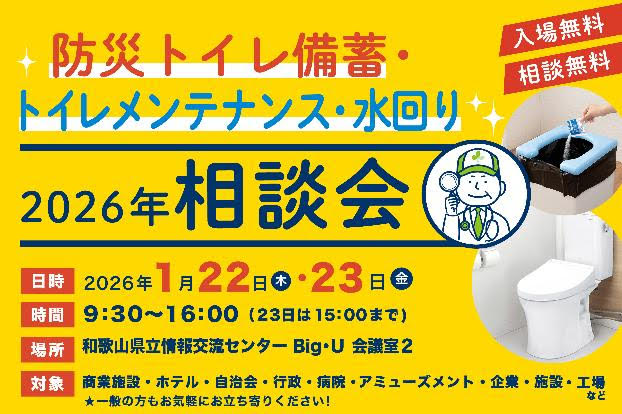 2026年1月22日(木)・23日(金)、田辺市の和歌山県立情報交流センター「Big-U」で、「防災トイレ備蓄・トイレメンテナンス・水回り相談会2026」が開催されます。