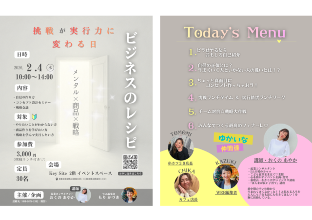 2026年2月4日(水)、和歌山市のイベントスペースKey Siteで「ビジネスのレシピをつくる」が開催されます。岩出市でこども食堂や勉強会を開いている企業コンサルタントの奥野さんが主催する、大人の学びと遊びを混ぜ込んだ新しいイベントセミナーです。