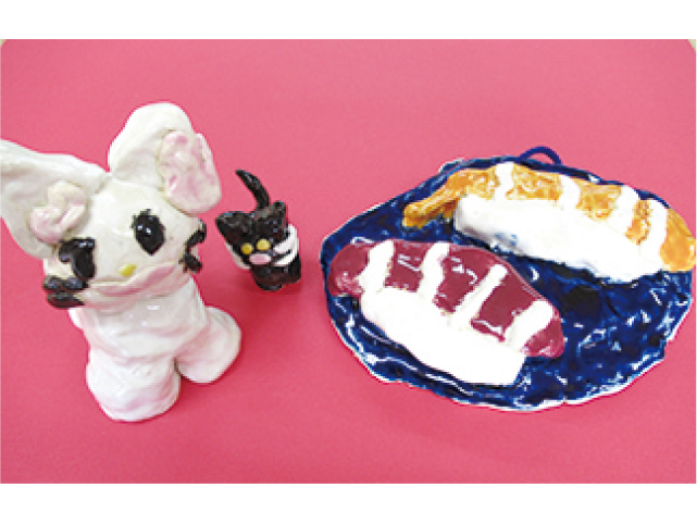 【展示内容】日前幼稚園の年少組と年中組の紙粘土、年長組の本焼き・壁掛け・七宝焼きなどの作品