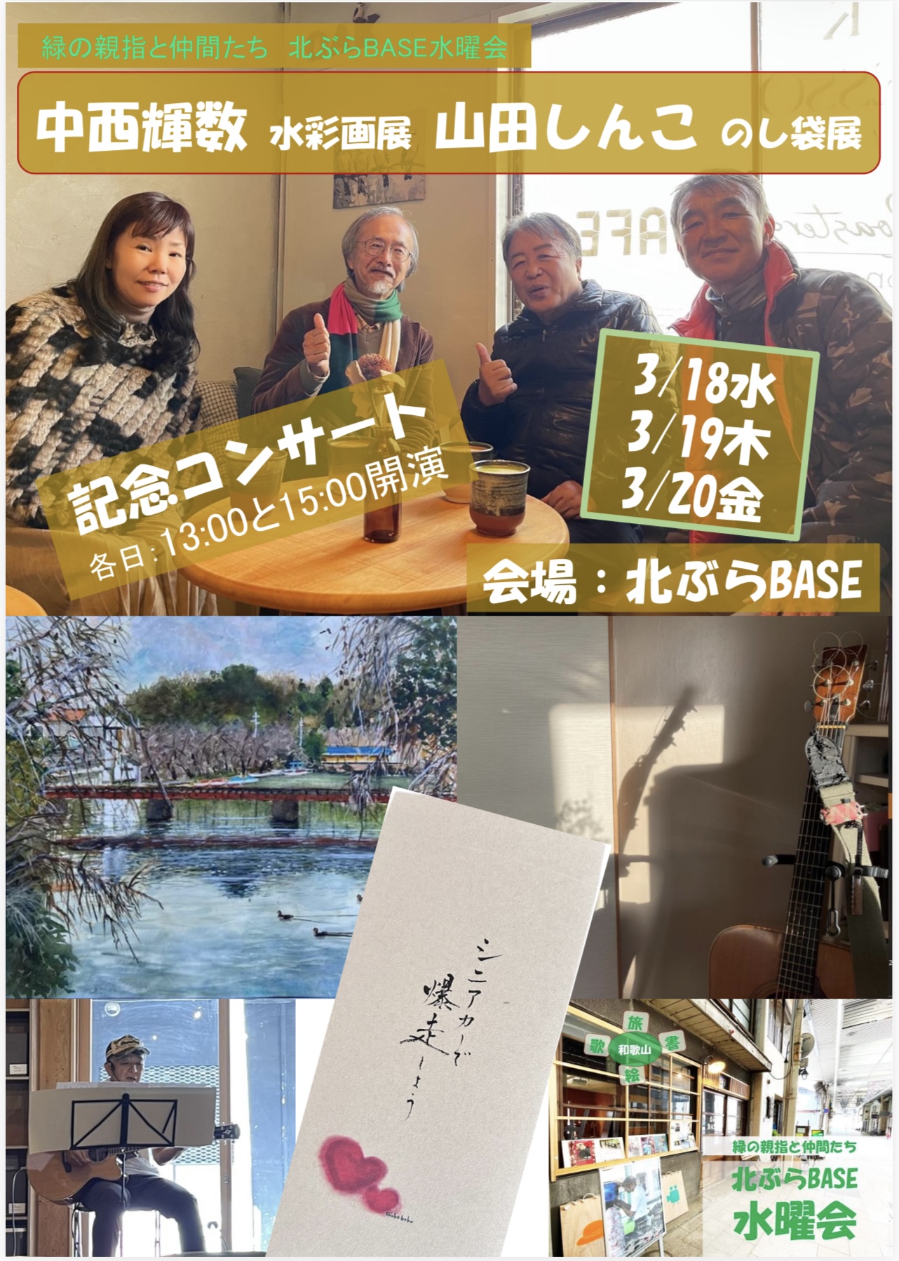 和歌山在住の中西輝数さんによる和歌山の自然を描いた水彩画と、創作のし袋作家山田しんこさんによる和歌山由来の作品を展示。13:00と15:00の2回、和歌山で作られた歌とギター演奏もあります。和歌山発の「絵」、「書」、「歌」、「旅」の展示、発表会です。