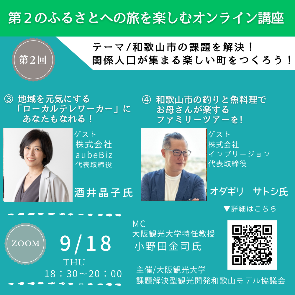 このたび「地域課題解決型和歌山モデル事業」が採択されました。本日のセミナーでは和歌山市に滞在してテレワークする魅力や体験できる観光コンテンツを紹介しながら、和歌山市の課題を解決できる関係人口を探ります。