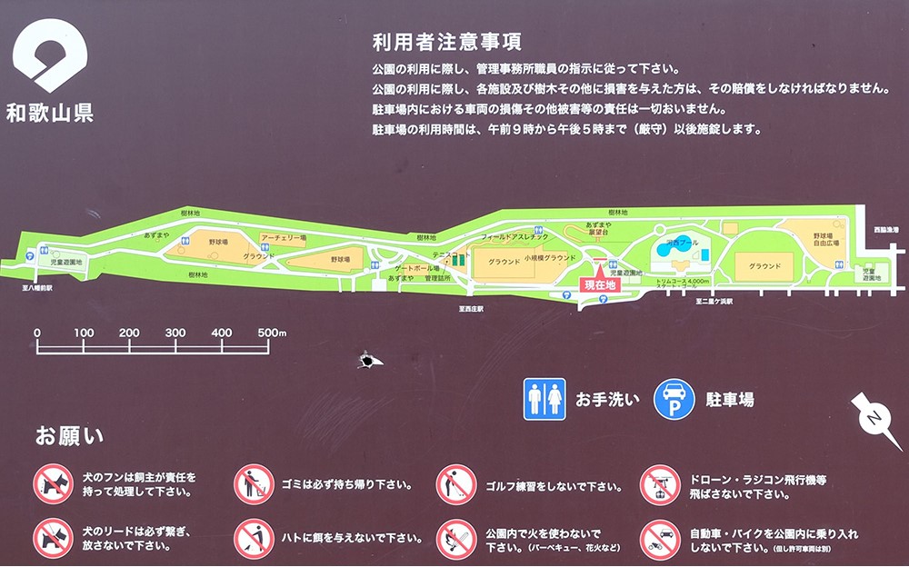 公園内にはトイレが6カ所、駐車場は3箇所あります。駐車場の利用時間は9:00~17:00までなので、要注意です!