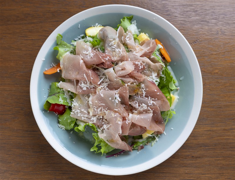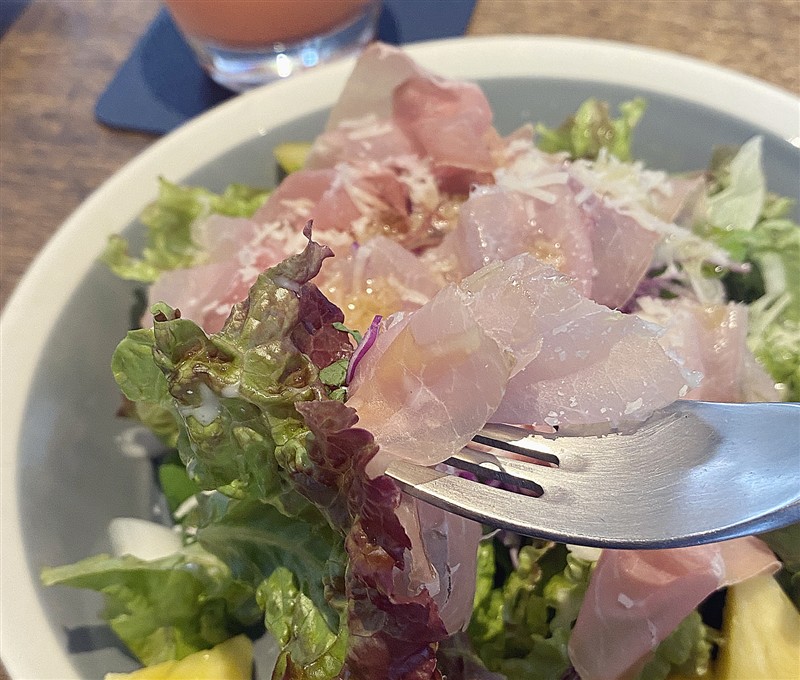まさしくカウンターにある手動の生ハムスライサーで、薄~くスライスされた生ハムが、ふわっとたっぷりトッピングされていて、ランチタイムにちょっぴり贅沢な気分に。