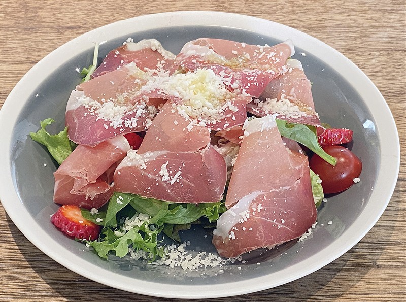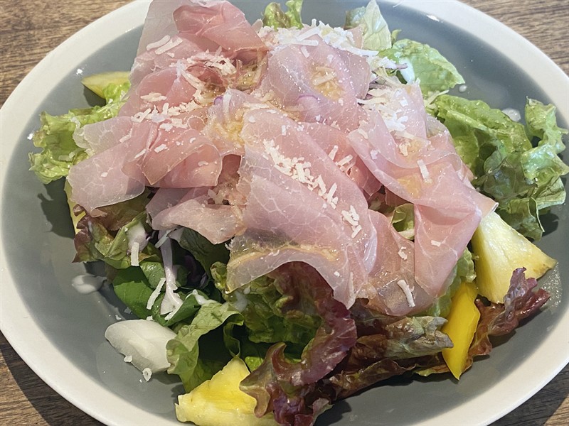 野菜に加えて、自家製のピクルスや季節のフルーツもトッピング。生ハムとフルーツの甘み、この黄金コンビがランチの一品として味わえます。