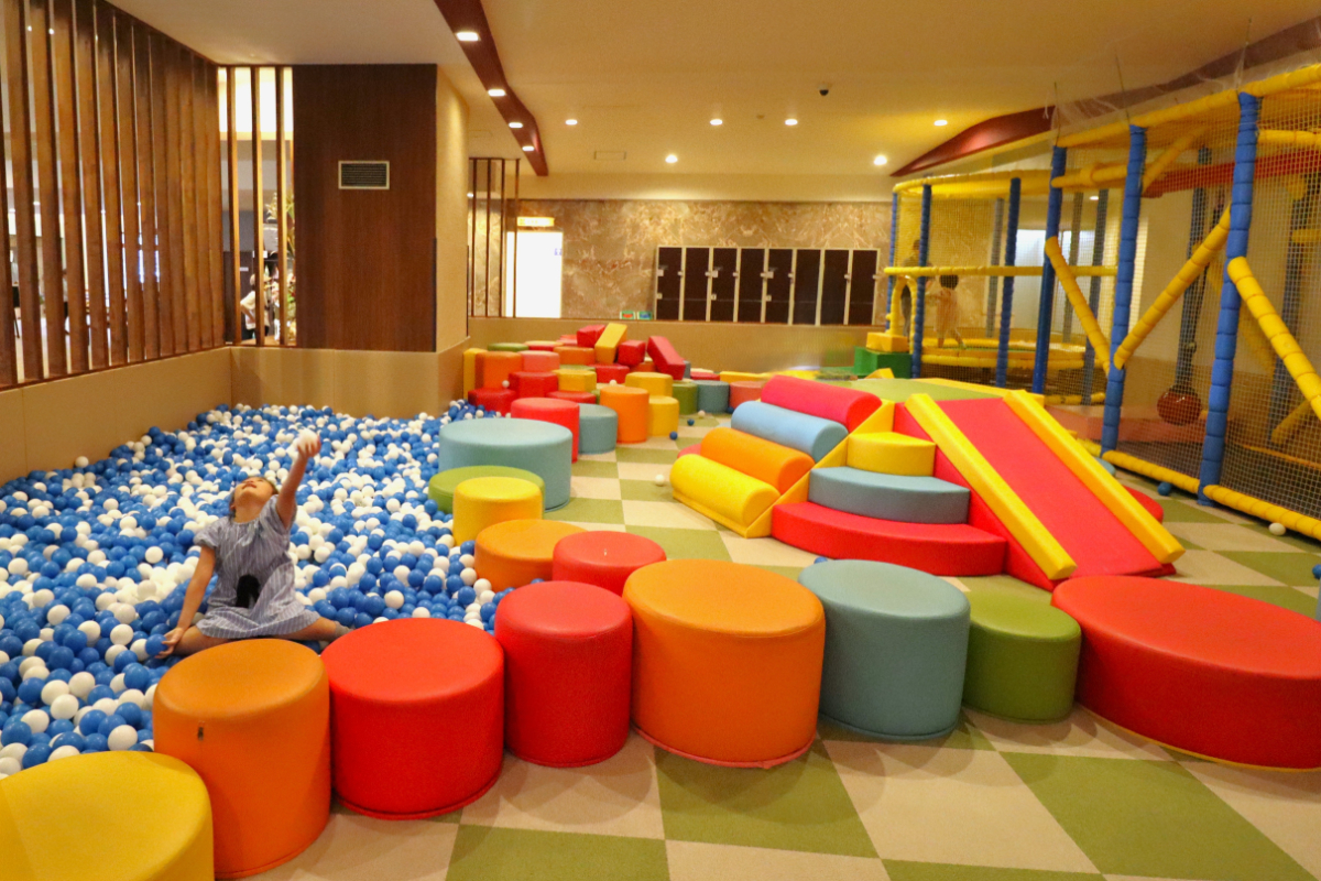 「大江戸温泉物語Premium 白浜彩朝楽」の大きな魅力のひとつが、全力で子どもが楽しめる設備の充実ぶり。館内にはキッズコーナーがあり、ボールプールやトランポリン、ボルダリングまで揃っており、子どもは大はしゃぎ! ゲームコーナーもあり、夕食後のちょっとした時間にも遊べるのが◎。