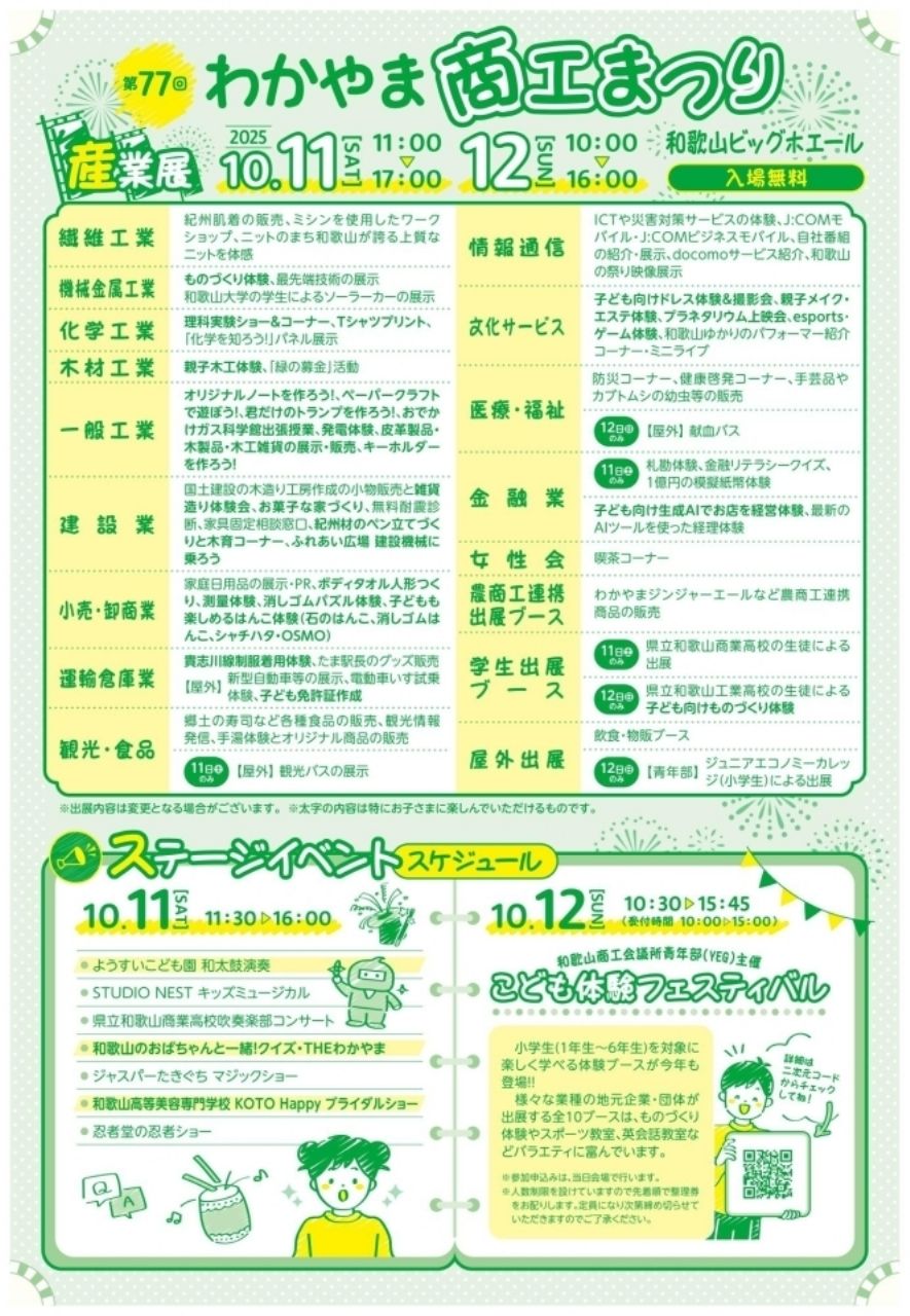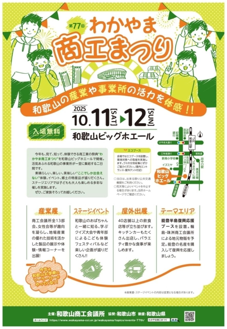 和歌山ビッグホエールで、地域の産業・技術を一堂に集めた「第77回 わかやま商工まつり」が、10月11日(土)・12日(日)の2日間開催されます。入場無料で、老若男女問わず楽しめる充実のプログラムが揃っています。