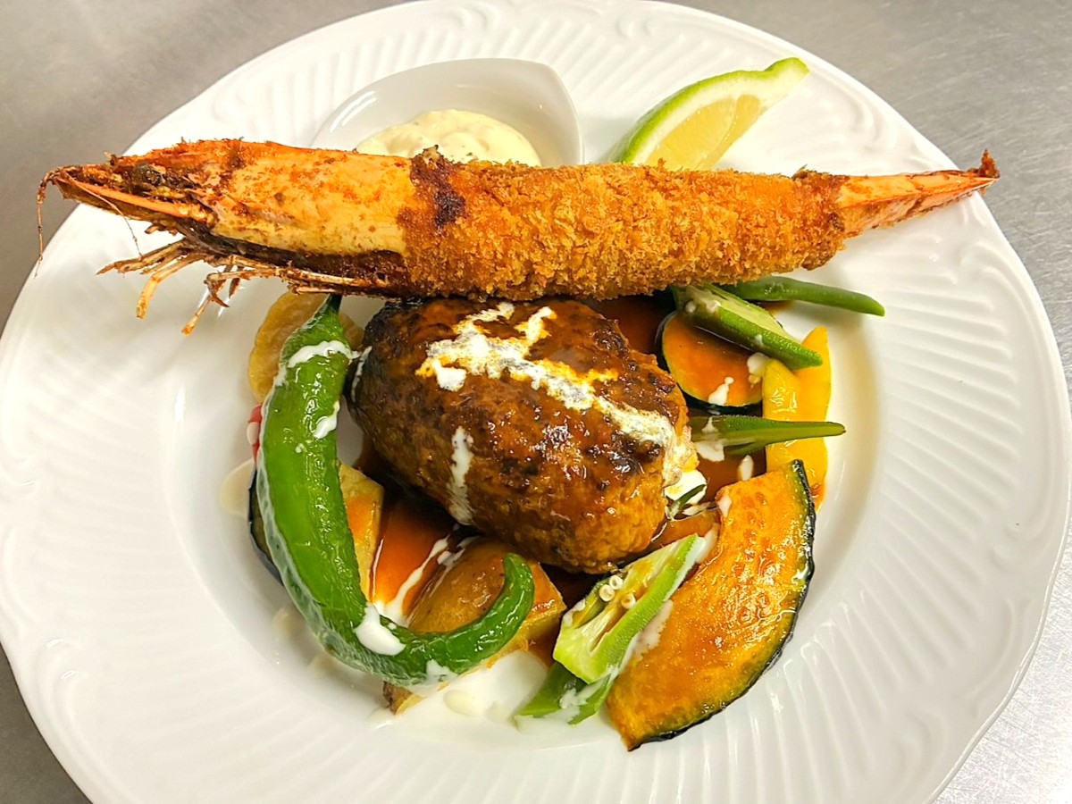 今回ご紹介した「ポークカツのオムレツライス」以外にも、ランチの「牛肉オムレツライス」(1850円)や「有頭エビフライ+ハンバーグ(サラダ、スープ、ドリンク付)(2550円)など、美味しそうなメニューが並んでいます。