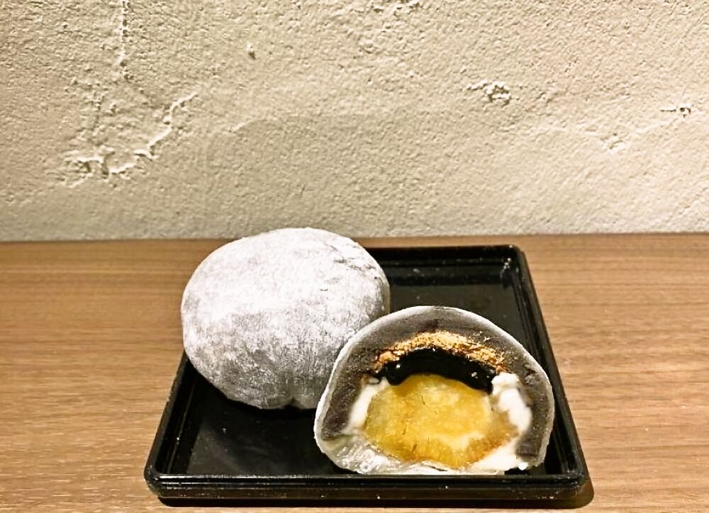 もちもちの求肥(ぎゅうひ)の中には、なめらかなお芋ペーストと豆乳クリーム、そして上品な甘さの餡(あん)がバランスよく包まれており、口に入れた瞬間、やさしい味わいが広がります。乳製品不使用なのも嬉しいポイントで、ヘルシー志向の人にもおすすめです。