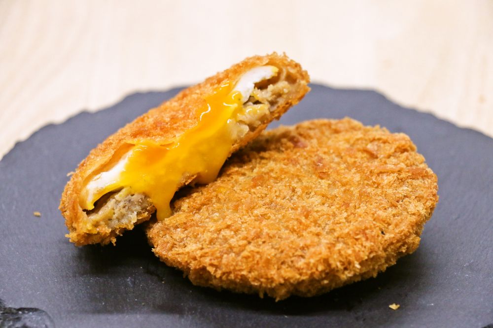 秋のおすすめは、「月見メンチ」(350円・数量限定)。肉汁の旨みと、月見ならではのまろやかな卵のコクが重なり合う贅沢な一品です。