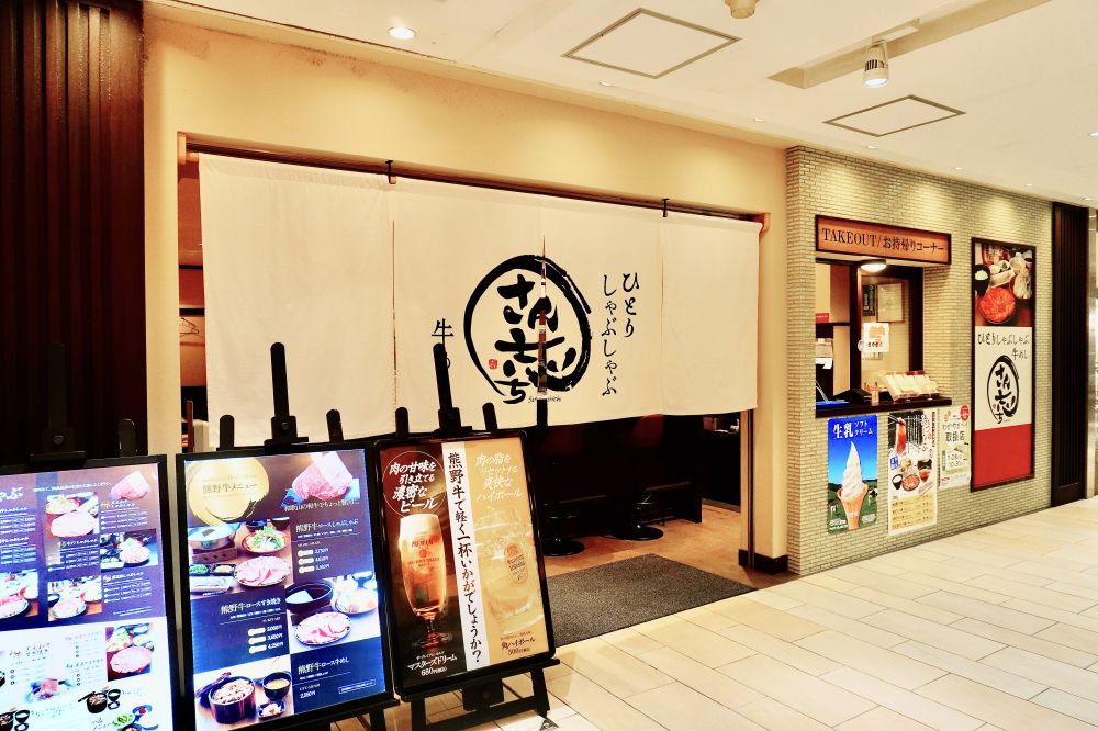本館の地下1階、目印は入り口にかかる「さん志ち」の特大のれん。早くて美味い駅地下グルメにあって、1人でも「しゃぶしゃぶ」が手軽にリーズナブルに楽しめるお店です。店内はオープンキッチンを囲うようにカウンター席が設けられ、家族連れにも嬉しいテーブル席も完備。こだわりは注文を受けてからオープンキッチンでスライスされる新鮮なお肉。もちろん国産牛、黒毛和牛、熊野牛などお肉の種類も豊富なうえ、品質にも自信あり。