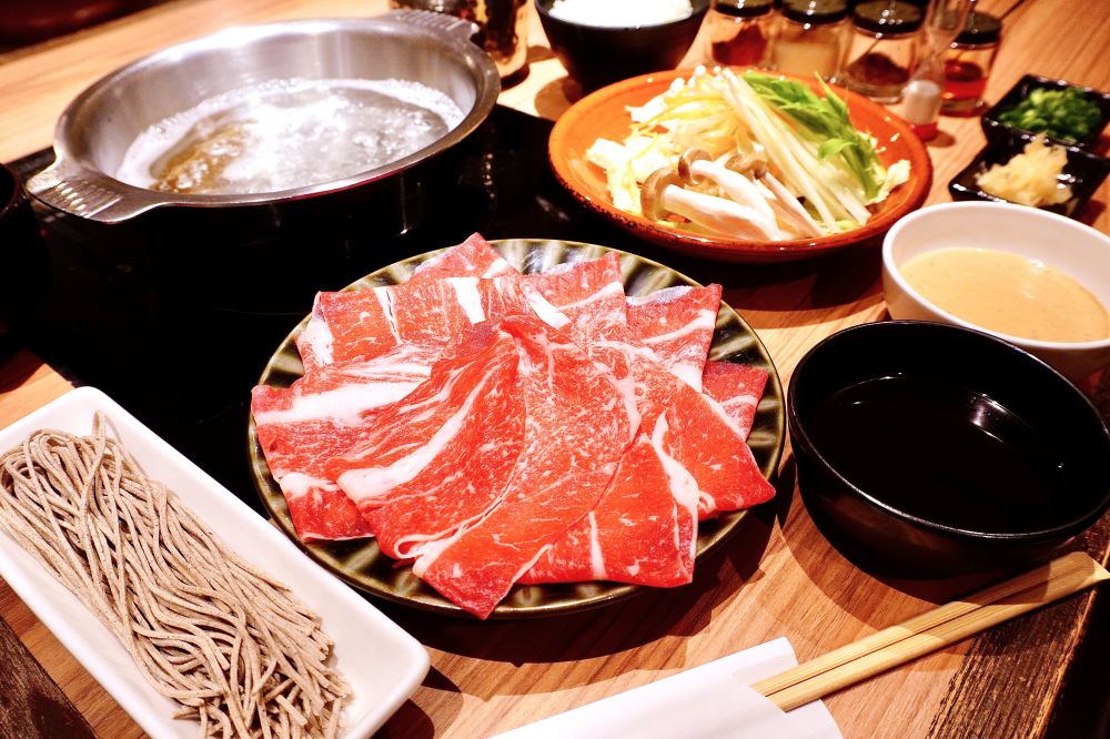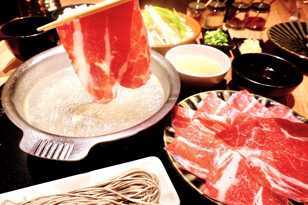 国産牛は昆布だしでサッとしゃぶしゃぶ。蕎麦かご飯を選べるセット(Sサイズ1910円ほか)も用意されています。
