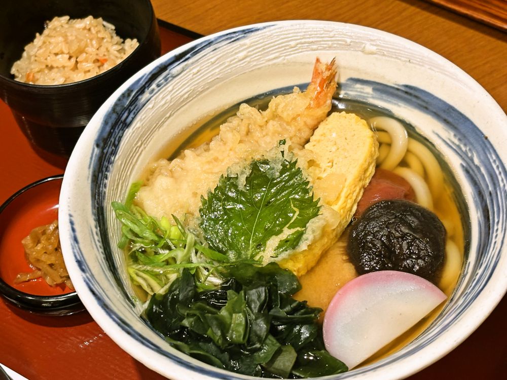 秋のおすすめは、大きな海老天ぷらをはじめ、出汁巻きやシイタケなど具だくさんでボリュームたっぷりの「彩りうどん定食」(1350円)。かやくご飯がついて満足度の高い内容です。 ほかにも10月から「牛すじフェア」を実施中。かやくご飯付きの「牛すじこんうどん定食」(1270円)ほか、「牛すじこん丼」(1380円)もおすすめです。