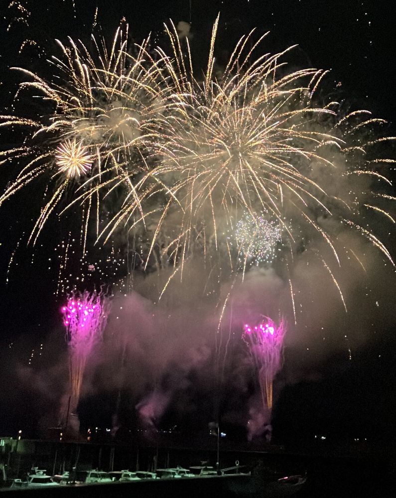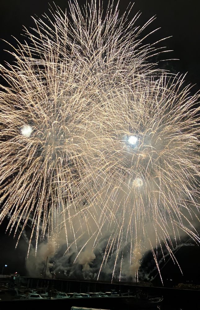 打ち上げられるのは約2000発の花火。漁港に停泊する船舶の向こう側で大輪の花が咲き、水面にはその光が幻想的に映り込みます。さらに、300機のドローンによる光のショーも加わり、観客を魅了します。