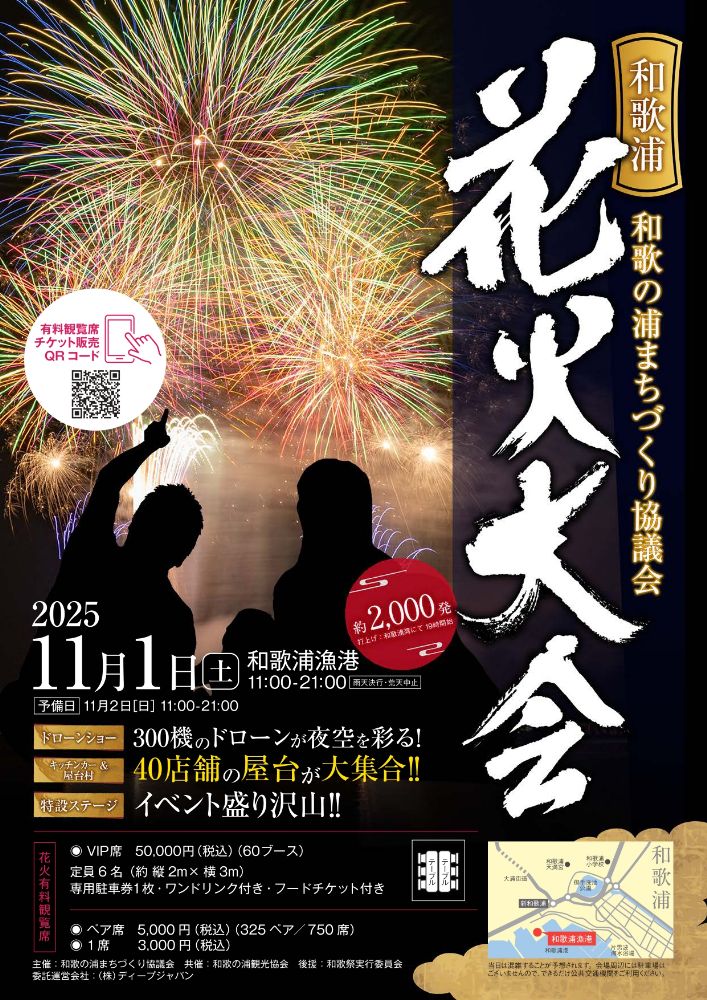 和歌山市和歌浦の秋を彩る「和歌浦花火大会」が2025年11月1日開催!約2000発の花火と300機のドローンショーが海辺を幻想的に演出。キッチンカーや屋台も多数出店予定!