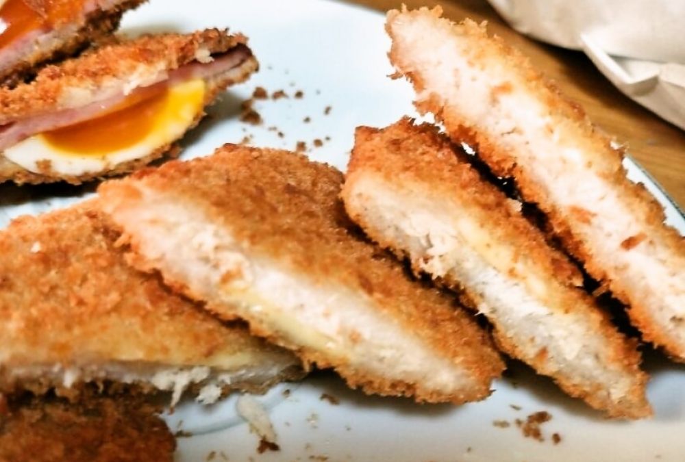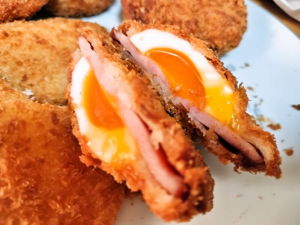 サクッと揚がった衣の中には、半熟に仕上げられたとろ〜り黄身のゆで卵と、しっかりうまみの詰まったハム。
