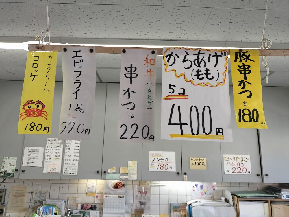 ショーケースに並んでいない商品も、店内に掲示されたメニューを見て注文できるのが「美津濃」スタイル。エビフライや串かつ、からあげ、カニクリームコロッケなど、バリエーション豊富なお惣菜がずらり。どれも注文を受けてから揚げてくれるので、揚げたてアツアツの味を楽しめるのが嬉しいポイントです。