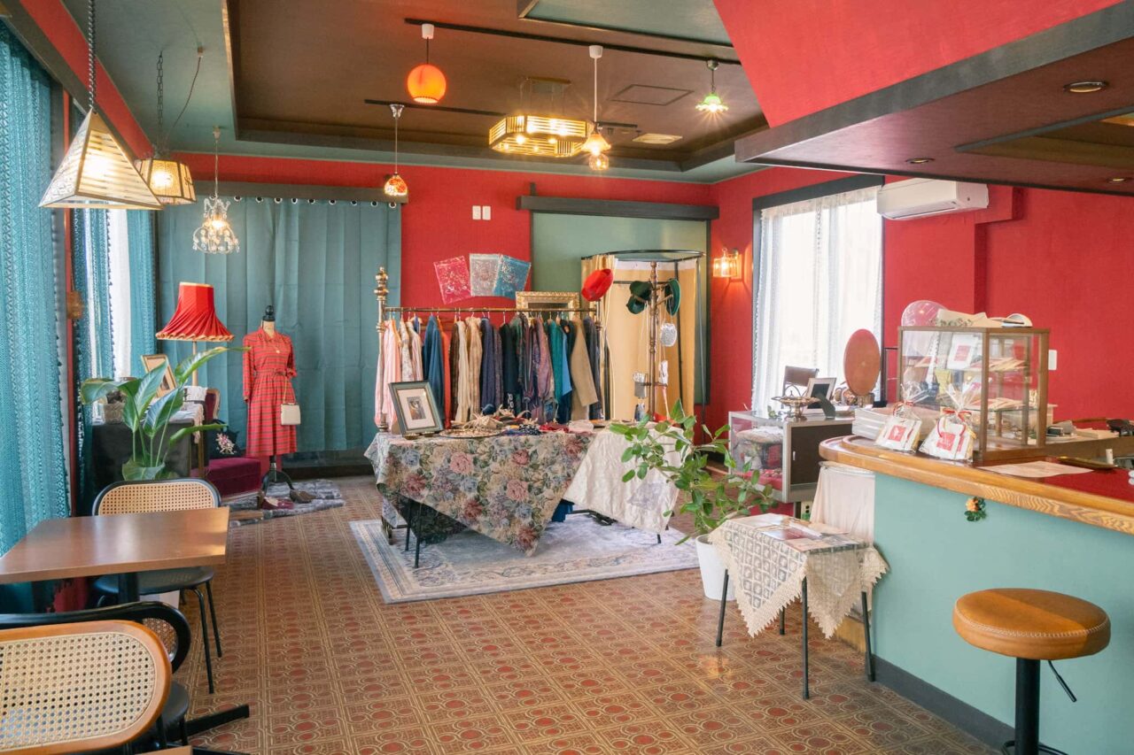 お店の奥のスペースでは、オーナーの目利きで各地から仕入れたアンティーク雑貨や古着、ファッション小物などが販売されています。