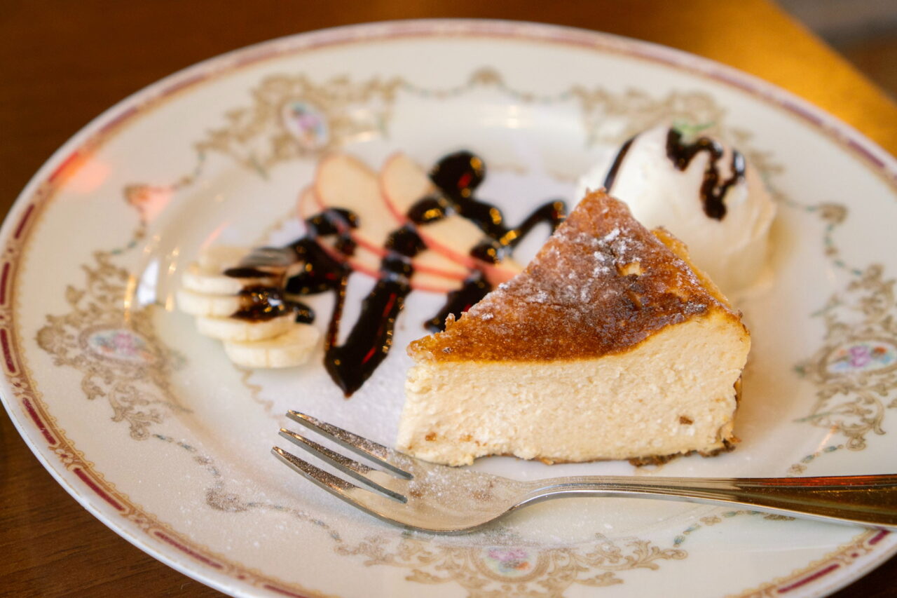 米粉を使った自家製バスクチーズケーキは、口に入れるととろけるようなしっとり食感が楽しめます。チーズ本来の濃厚な風味をしっかり感じられながらも、軽やかな口当たりで甘さが控えめの大人の味わい。