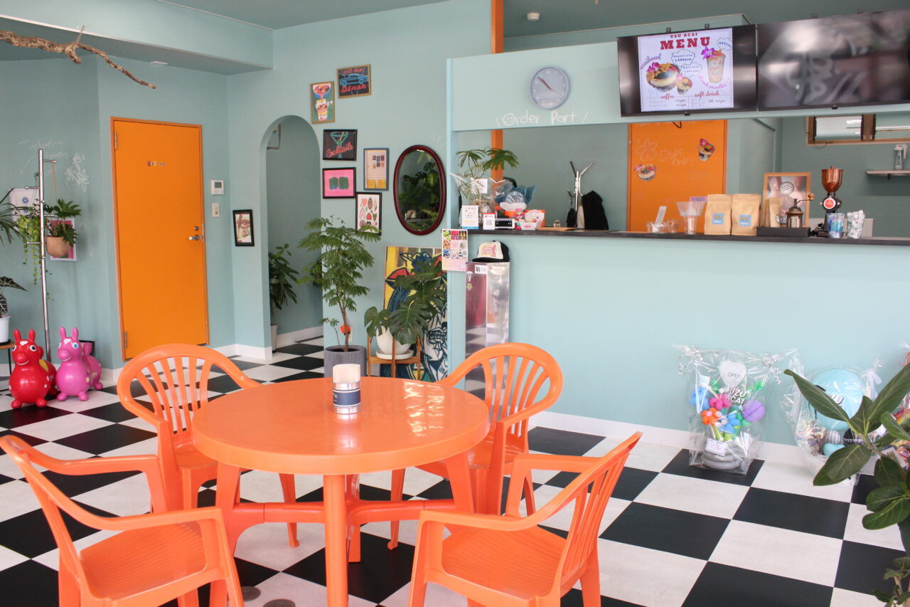 中にはテーブル席やソファー席、カウンターが並び、水色の壁にオレンジのドアやテーブルが映え、思わず写真を撮りたくなるかわいさです。