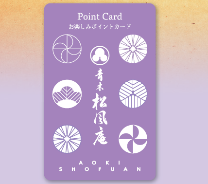 購入金額に応じてポイント加算。ポイントがたまるとランクに応じた青木松風庵のお買物券(500円~700円)がもらえるポイントカードです。