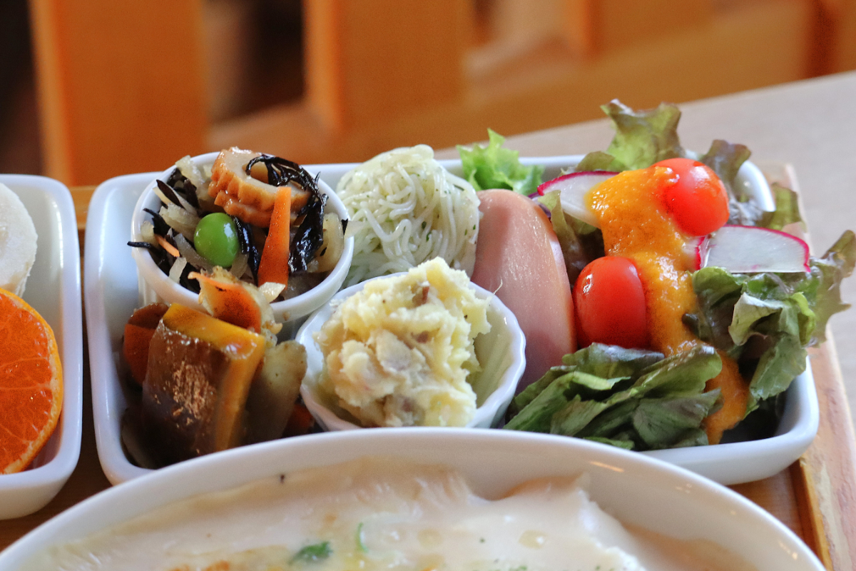 ランチには、季節により変わる果物や副菜がたっぷりついています。訪れた際は、サラダにきゅうり・人参・大根の酢の物、ジェノベーゼ風そうめん、ポテトサラダ、かぼちゃ・にんじん・ごぼう・山椒の煮つけにひじき。ボリューム満点です。
