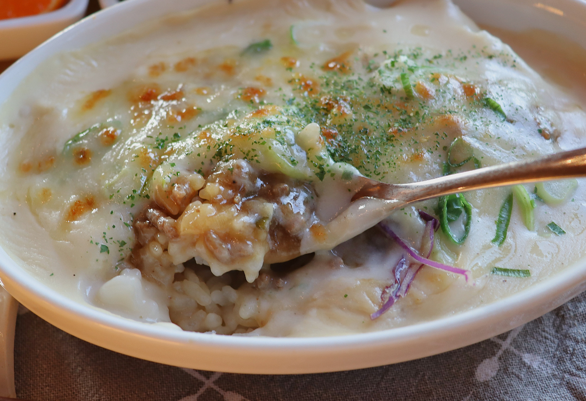 さて、お待ちかねの肉みそドリアをひと口。香ばしい醤油ベースの甘辛い肉みそが、とろりとした餡に包まれ、やさしい和風ドリアに仕上がっています。しょうがのピリッとした刺激がアクセントになり、食べ進めるほどに体が温まる味わい。“優しい店の優しいごはん”という言葉がぴったりの一皿です。