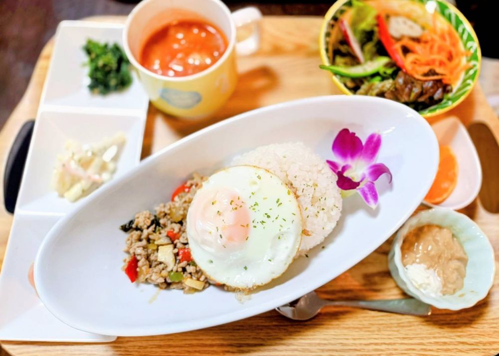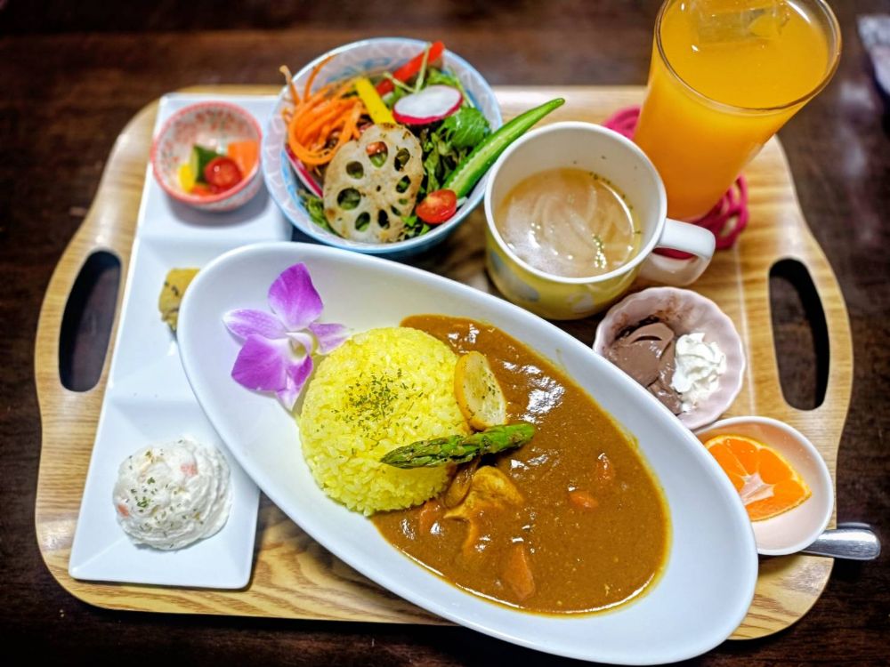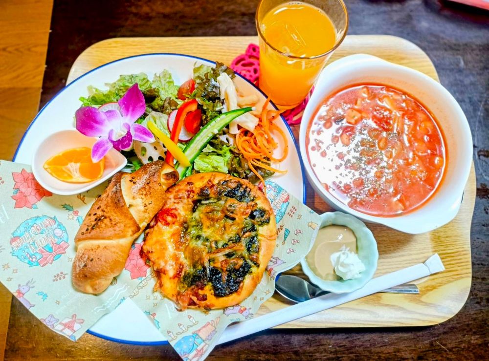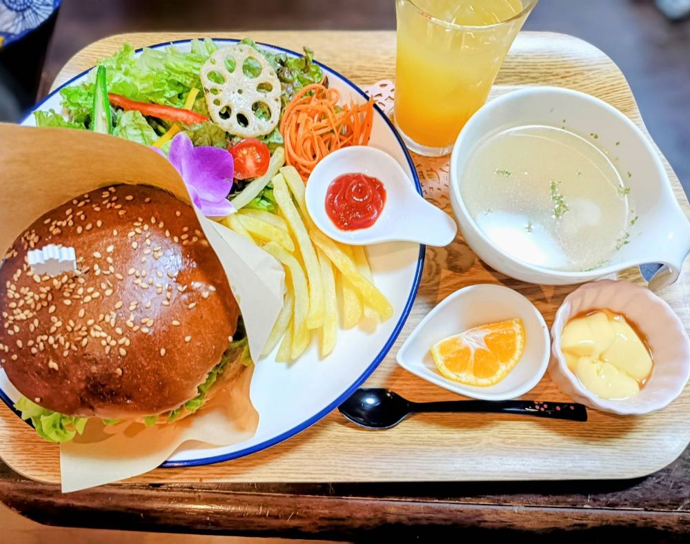 週替わりのAセットは、パンかバーガーのどちらか。どちらを食べられるかは行ってみてのお楽しみ。景色に合わせて南国をイメージしたメニューが、気分を高めてくれます。