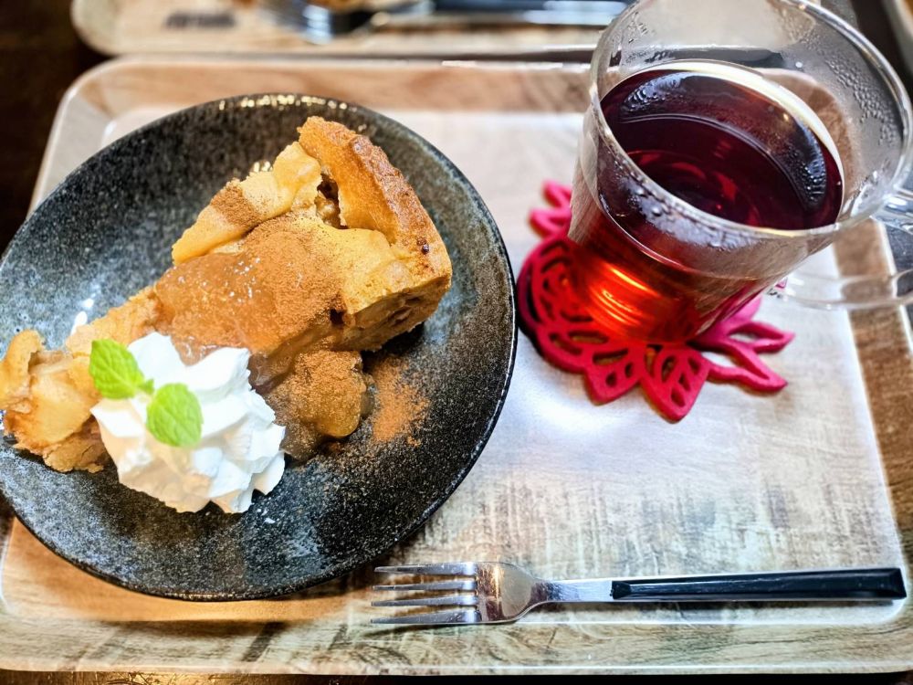 カフェタイムのおすすめはアップルパイ。ゴロゴロのりんごが満足感満点。コーヒーと一緒に至福の時間を過ごせます。