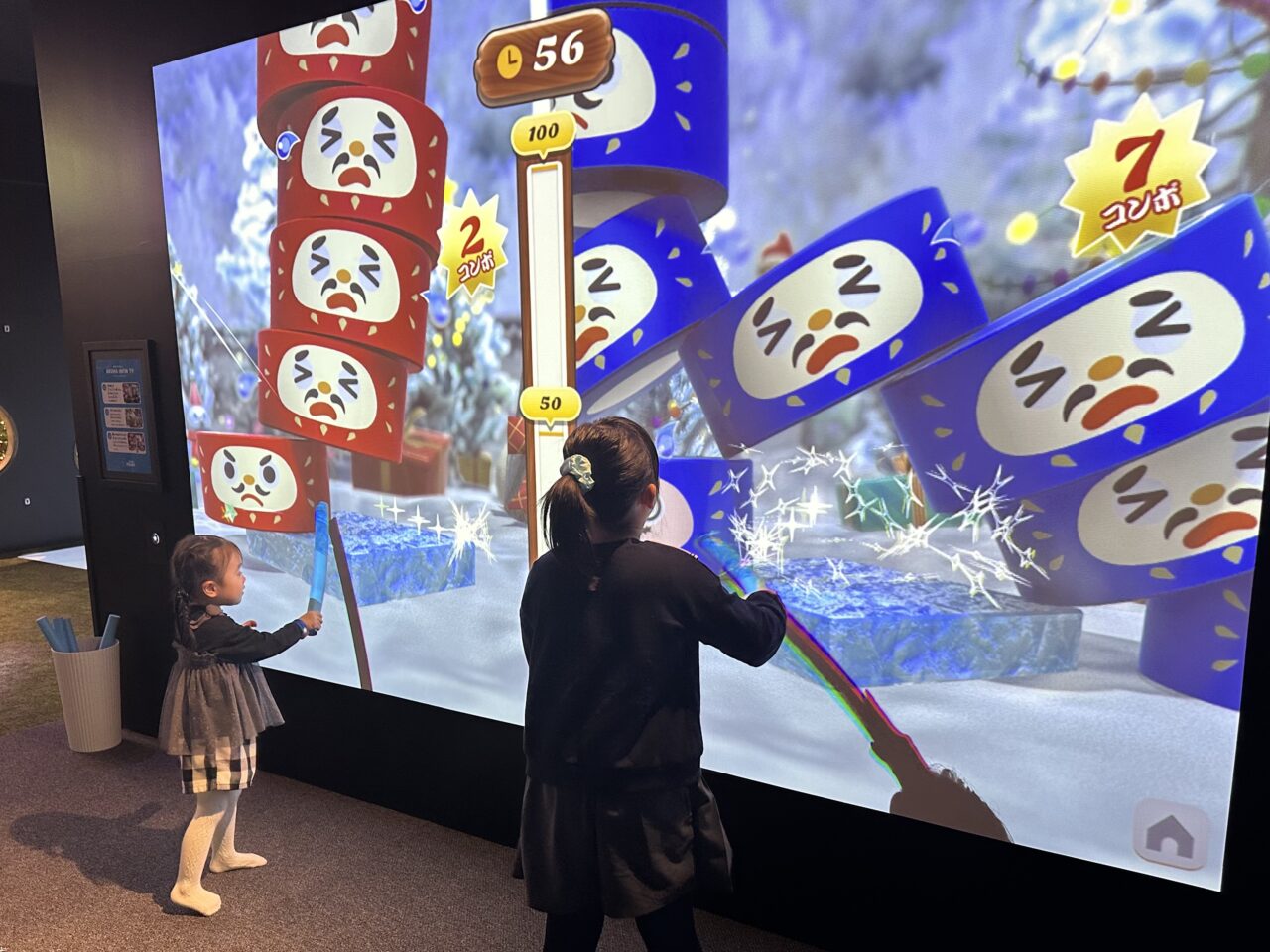 高く積み上げられただるまを、専用スティックでテンポよく打ち落としていくデジタルだるま落とし「DARUMA INFINITY(ダルマインフィニティ)」。1人でも2人でも楽しめ、スピードと集中力、バランス感覚が試されます。なるべく水平に打たないと、だるまが一気に崩れてしまうのもスリリング。成功した段数によってレベルが決まり、目指すは最上位の「神」レベル。思わず何度も挑戦したくなる爽快アクションです。