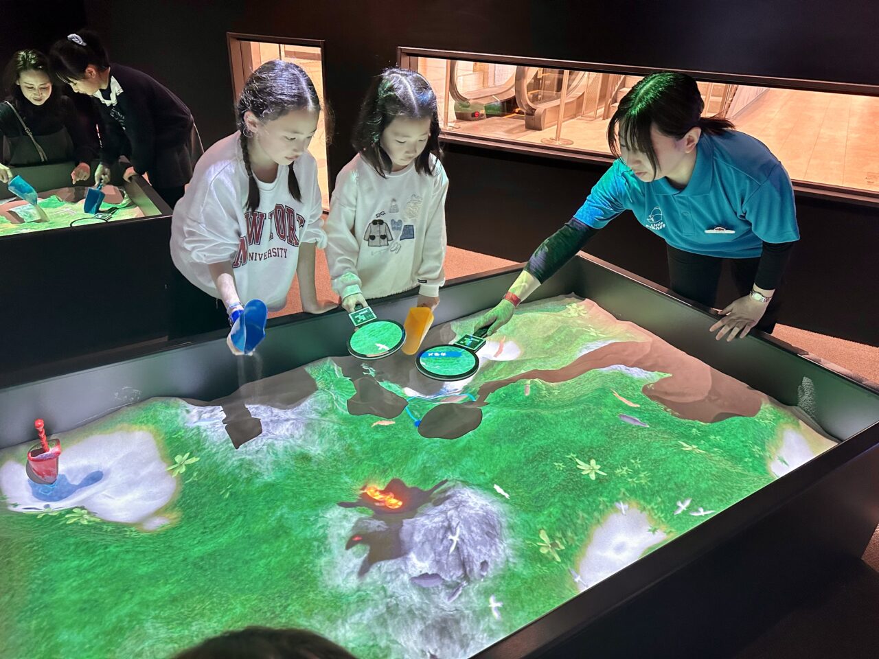 アトラクションは、全12種。中でも、ひときわ子どもたちの人気を集めているアトラクションが、AR砂遊び「SAND PARTY!(サンドパーティ)」。さらさらの砂に触れて山や川を作ると、その形に合わせて映像が投影され、まるで本物の大地のような世界が目の前に広がります。高く盛り上げれば山に、深く掘れば海に。遊び方次第で景色はどんどん変化し、自分だけの“自然の世界”を創り出せます。
