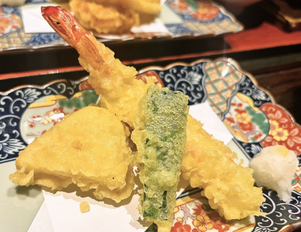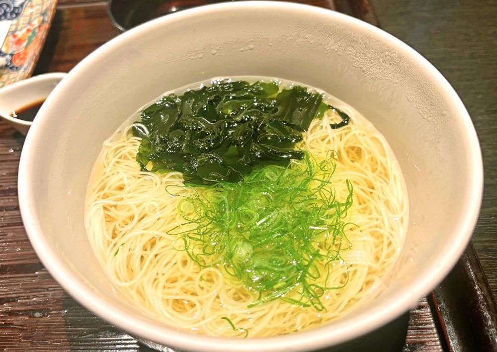 ランチの人気は「海鮮ちらし寿司御膳」(2800円)。彩り豊かなちらし寿司には、その日の仕入れによって変わる海の幸が贅沢に盛られます。冬は湯気立つ「にゅう麺」、夏は喉ごしのよい「素麺」が添えられ、さらに揚げたての天ぷらも付く満足度の高い一品。特に、にゅう麺のやさしい出汁は思わずほっと息をつくおいしさです。