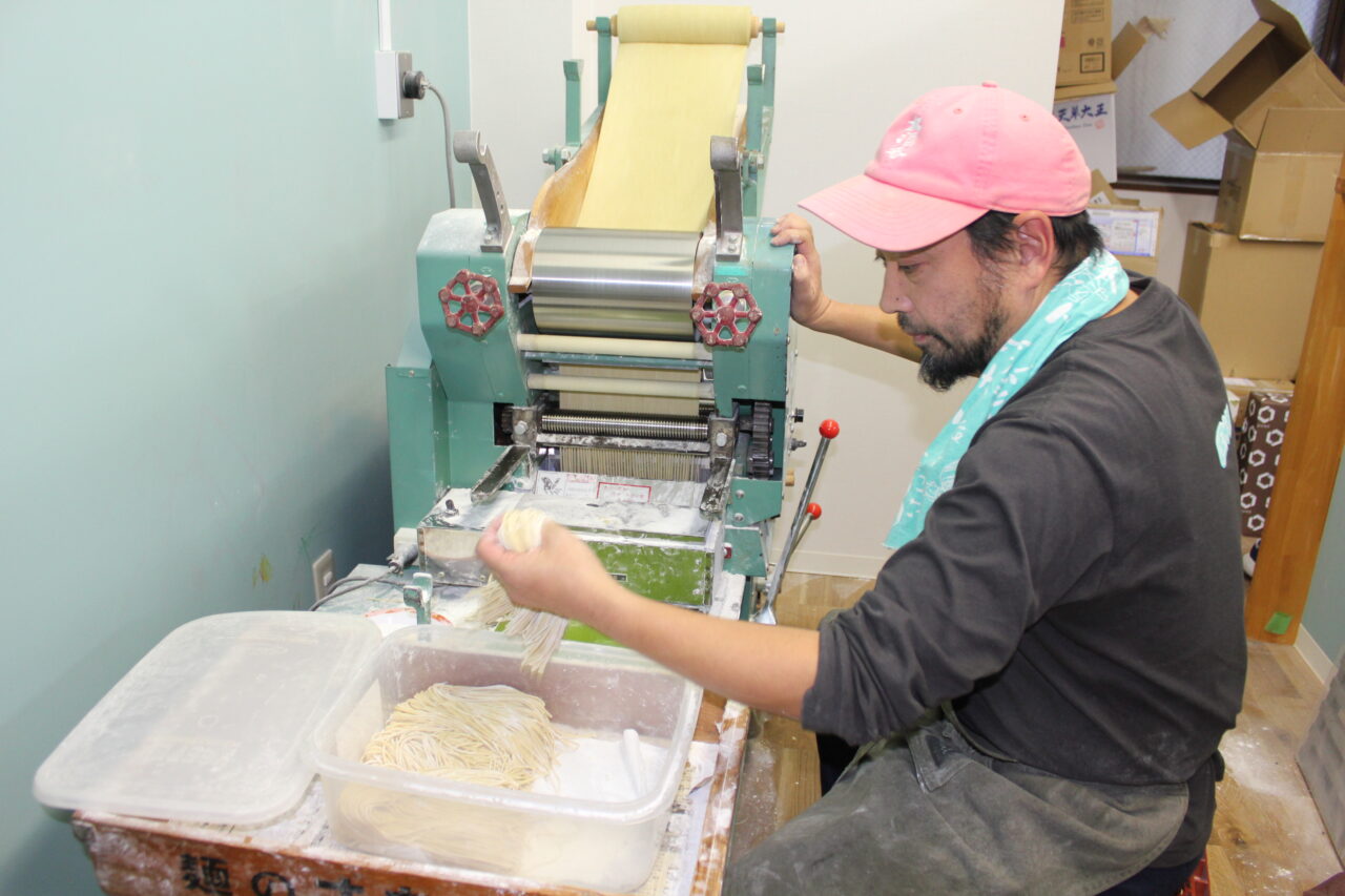 営業開始は10時ですが、毎朝5時頃から製麺やスープ作りなど準備を始めるそうです。こちらの製麺機は、東京から一緒に引っ越ししてきたそう。できあがった麺を一束一束見つめるまなざしが真剣です。