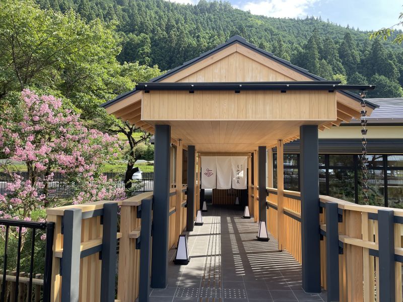 料理旅館「鮎茶屋」に併設された温泉施設。昼や夜の利用はもちろん、土・日曜、祝日は7:00から利用でき、朝風呂が楽しめます。塩分を含むナトリウム塩化物泉で、ぬるっとした肌触りで体が冷えにくいと評判です。