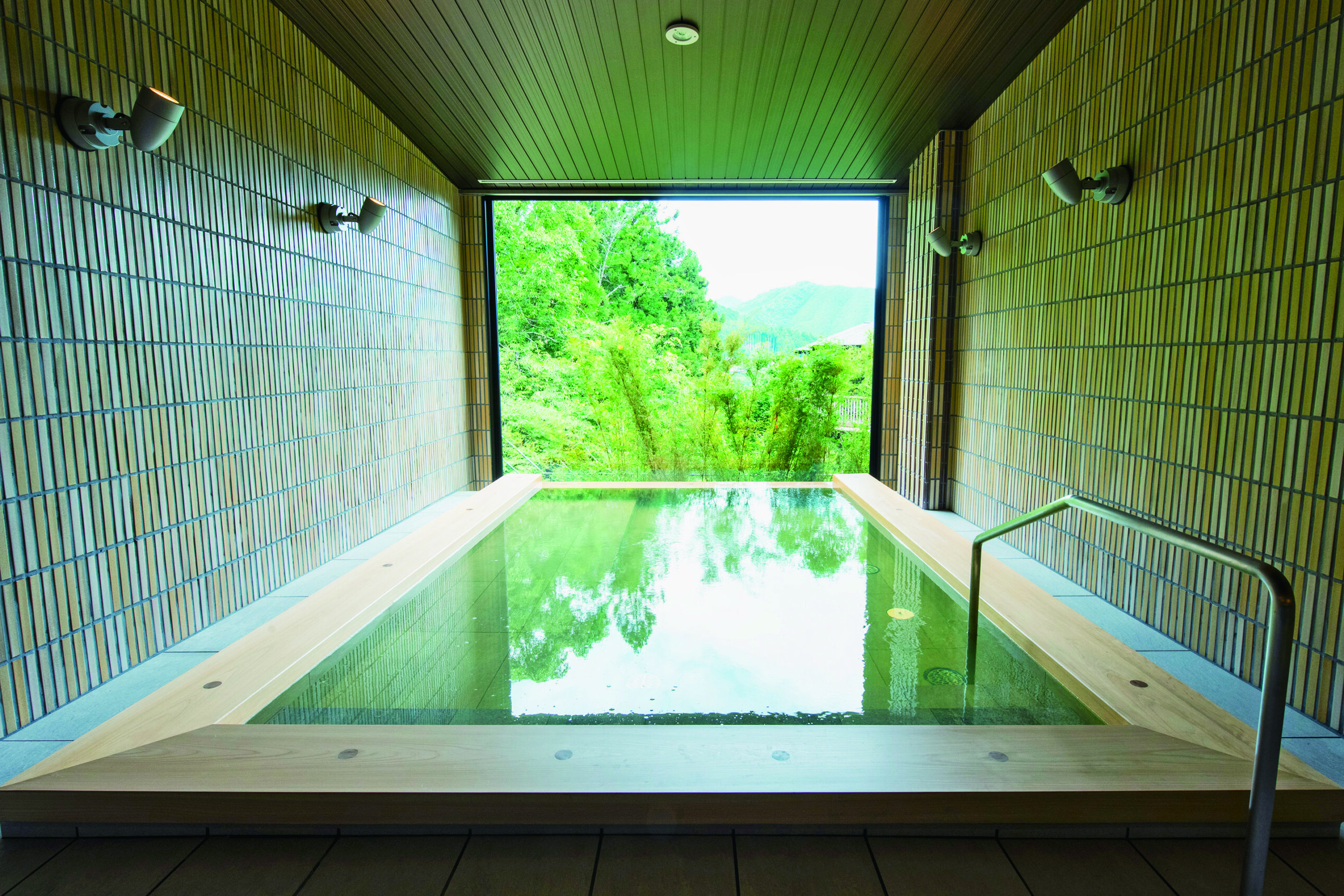 窓の額縁越しに広がる景色は、まるで絵画を眺めているかのような美しさです。温冷の交互浴が楽しめるほか、源泉をそのまま流し込んだ冷泉風呂やミストサウナも備えています。