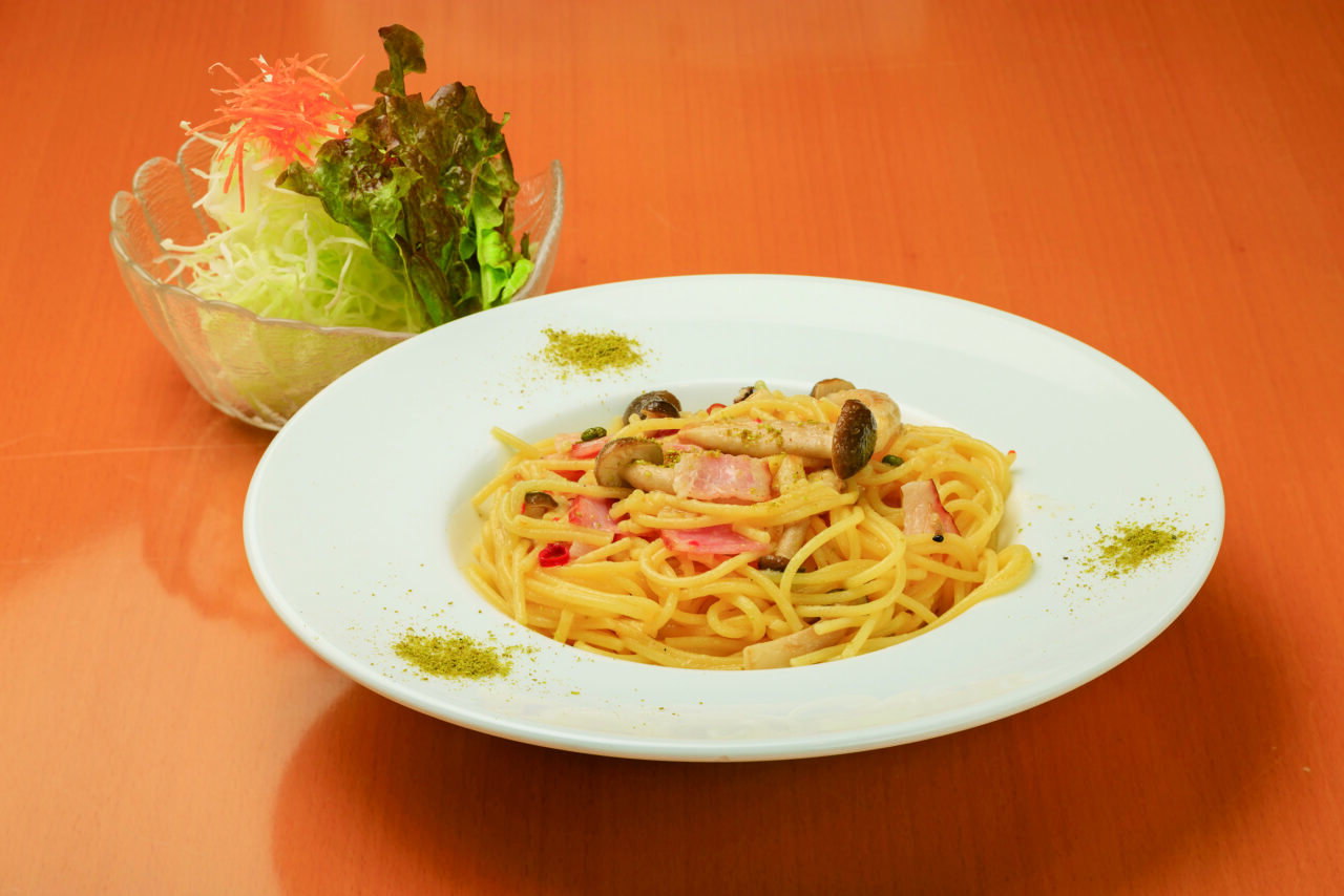 入浴後は、レストランや物販、宿泊棟を備えた「あさぎり」へ。「山椒ペペロンチーノ」や「こんにゃく御膳」(3000円、要予約)がある他、土・日曜限定で「揚げ出し豆腐と鯖めし定食」(1850円)も提供。