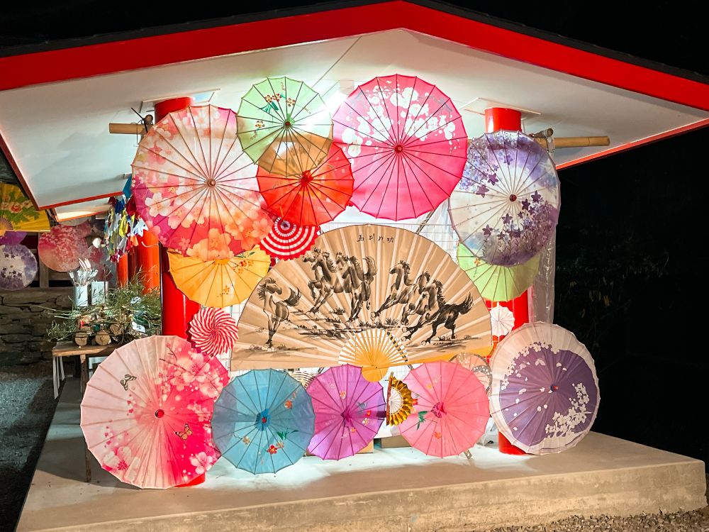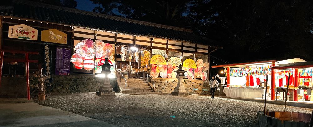 和歌山県海南市の春日神社で、2026年1月15日(木)まで「和傘飾り」が開催中。色とりどりの和傘が境内を彩り、昼は華やか、夜は幻想的な風景に。ライトアップ日には写真映えも抜群。かわいらしいレース仕立ての「除災招福守」も人気で、新年のお参りとあわせて楽しめます。
