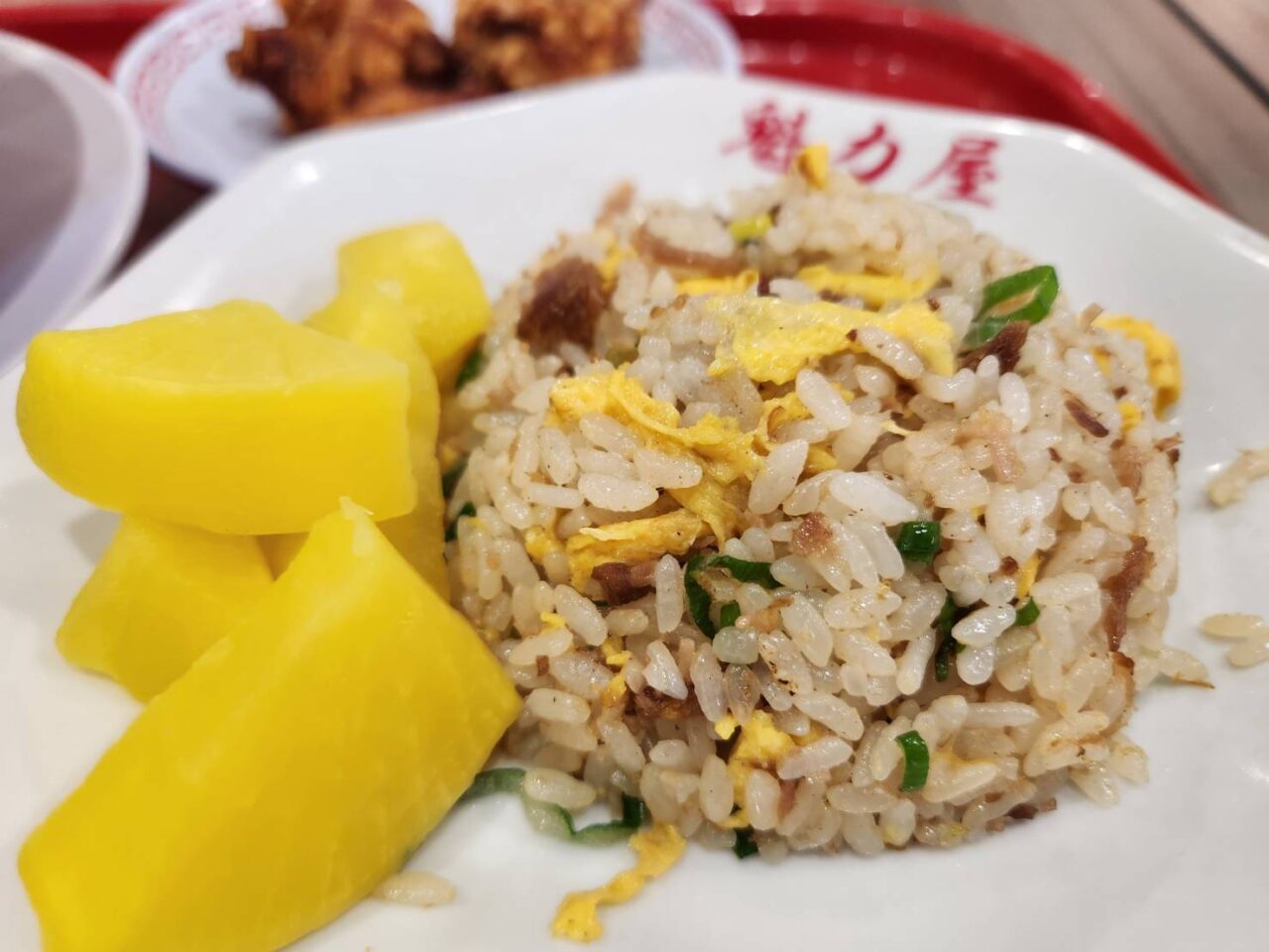 チャーハンの隣にたくあんが添えられていますが、実はこれ、無料で食べ放題なんです。背脂たっぷり、コク深い京都ラーメン。その合間に食べるポリポリ食感のたくあんのさっぱり感が、口の中をリセットしてくれます。