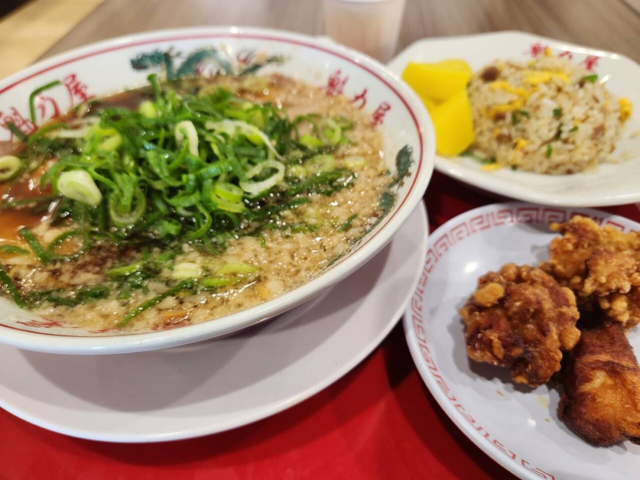 シャキシャキの九条ねぎがたっぷりのった「京都背脂醤油九条ねぎラーメン」。焼きめしと唐揚げを+400円でセットにしました。麺のかたさや背脂の量を好みで選べるのでお好みで。
