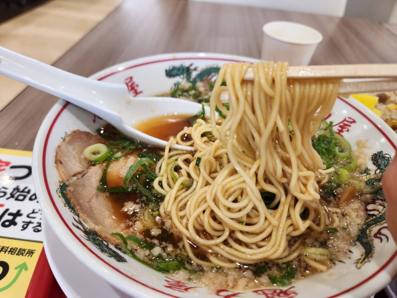 魁力屋の麺は、やや細めのストレート麺。背脂入りの濃厚スープをしっかり持ち上げ、口に運ぶたびにスープのコクと旨みをダイレクトに届けます。
