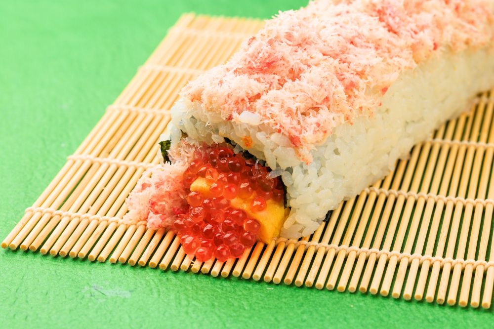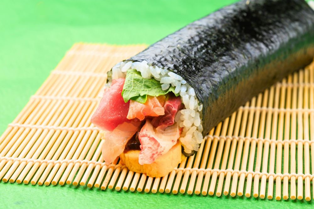 まずは中身を見て! あふれんばかりの8種類の具材。生マグロ、サーモン、ブリ、タイ、卵、かんぴょう、大葉、カニカマ…なんと贅沢な1本なんでしょう。大きな口を開けて、そのおいしさを堪能しましょう。