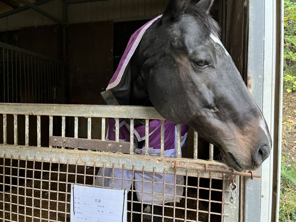 馬房(馬が個別に過ごす部屋)前のプレートには馬名と、血統を示す父と母の名前。競走馬として速く走ることが宿命づけられていましたが、引退後は勝負の世界から解き放たれ、穏やかな表情をしています。