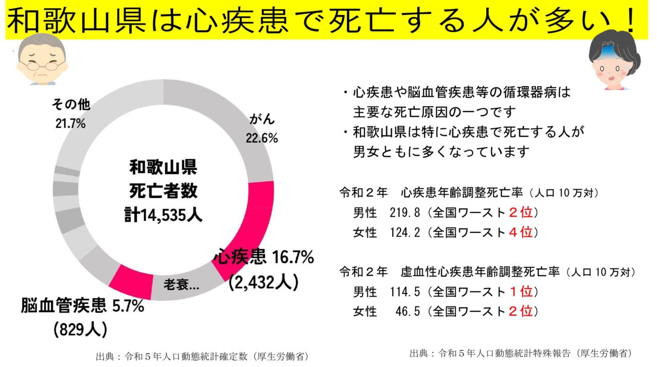 実際、和歌山県は全国と比べて、心疾患で亡くなる方や糖尿病の方が多い傾向にあります。