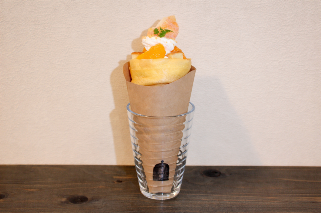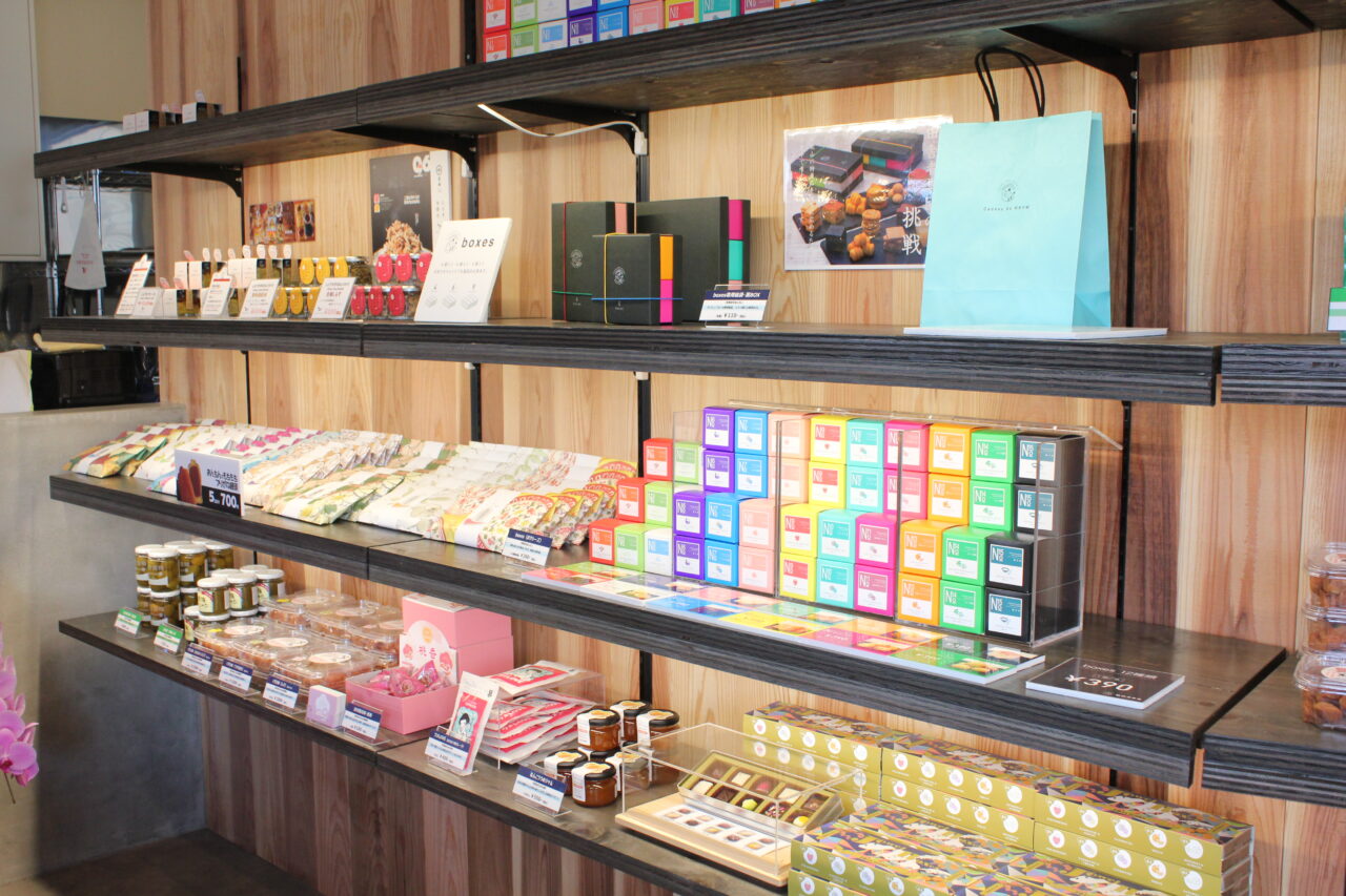 和歌山のめぐみがたっぷりの「みかんクレープ」は、観光客はもちろん地元民にもぜひ味わってもらいたい逸品。店内のお土産コーナーでも購入できる、高野口町の「オカザキ紀芳庵」の「有田クランチ」と「ドライみかん」、「山崎梅栄堂」の「和歌山みかんチーズケーキ」が入っています。