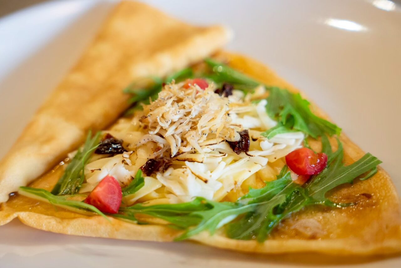 湯浅町の「しらす屋前福」のしらすとトマトの酸味をオリーブオイルで包み込んだ、大人のごちそうがおかずクレープに。ビールやワインにも合いそうです。